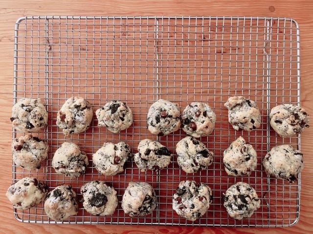 Every season is cookie season in my house. Here’s some cookies and cream cookies I made this week. I thought they were a tiny bit too cakey but I liked that you get to bash some Oreos into pieces and then fold them into the dough.